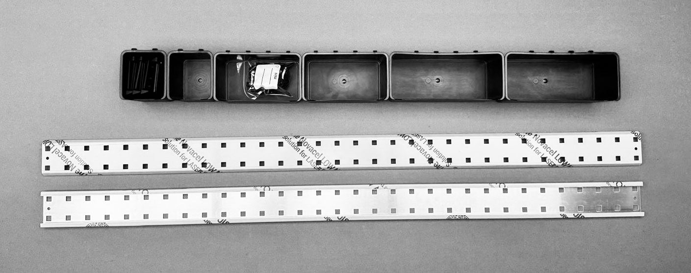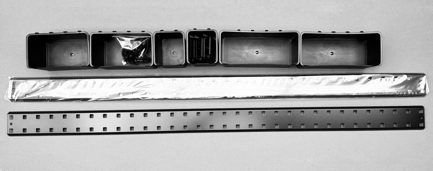 7713 ja 7714 -starttipaketit tarjoavat täydellisen aloituksen uuden säilytysjärjestelmän rakentamiselle. Starttipaketit sisältävät kaikki perusosat, joita tarvitset saadaksesi järjestelmän kätevästi käyttöön heti. Voit mukauttaa järjestelmääsi omien tarpeidesi mukaan: esimerkiksi 1200 mm kisko on suunniteltu muokattavaksi juuri haluamasi kokoiseksi. Kiskon katkaisu onnistuu kätevästi tavallisilla työkaluilla, kuten sirkkelillä, kulmahiomakoneella tai rautasahalla.